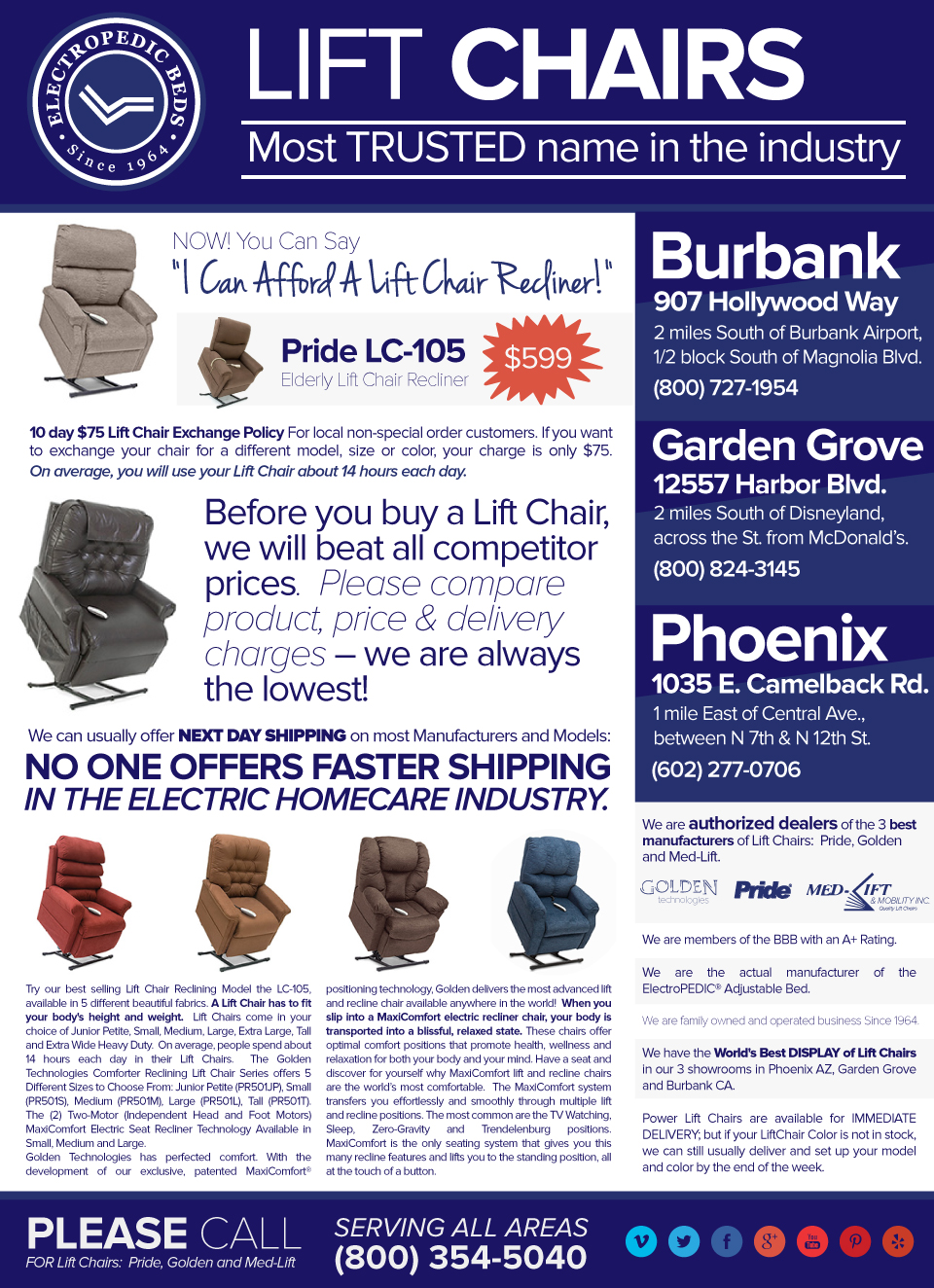 ![]() Authorized Dealer/Electropedic Lift Chair Showrooms 1035 E. Camelback Rd., Phoenix AZ 800-733-1818 LOS ANGELES 907 Hollywood Way, Burbank CA 800-233-738212557 Harbor Blvd., Garden Grove CA 800-824-3145Open Mon-Sat 10-5, Sun 12-4 SERVING ALL AREAS 800-233-7382 ![]() |